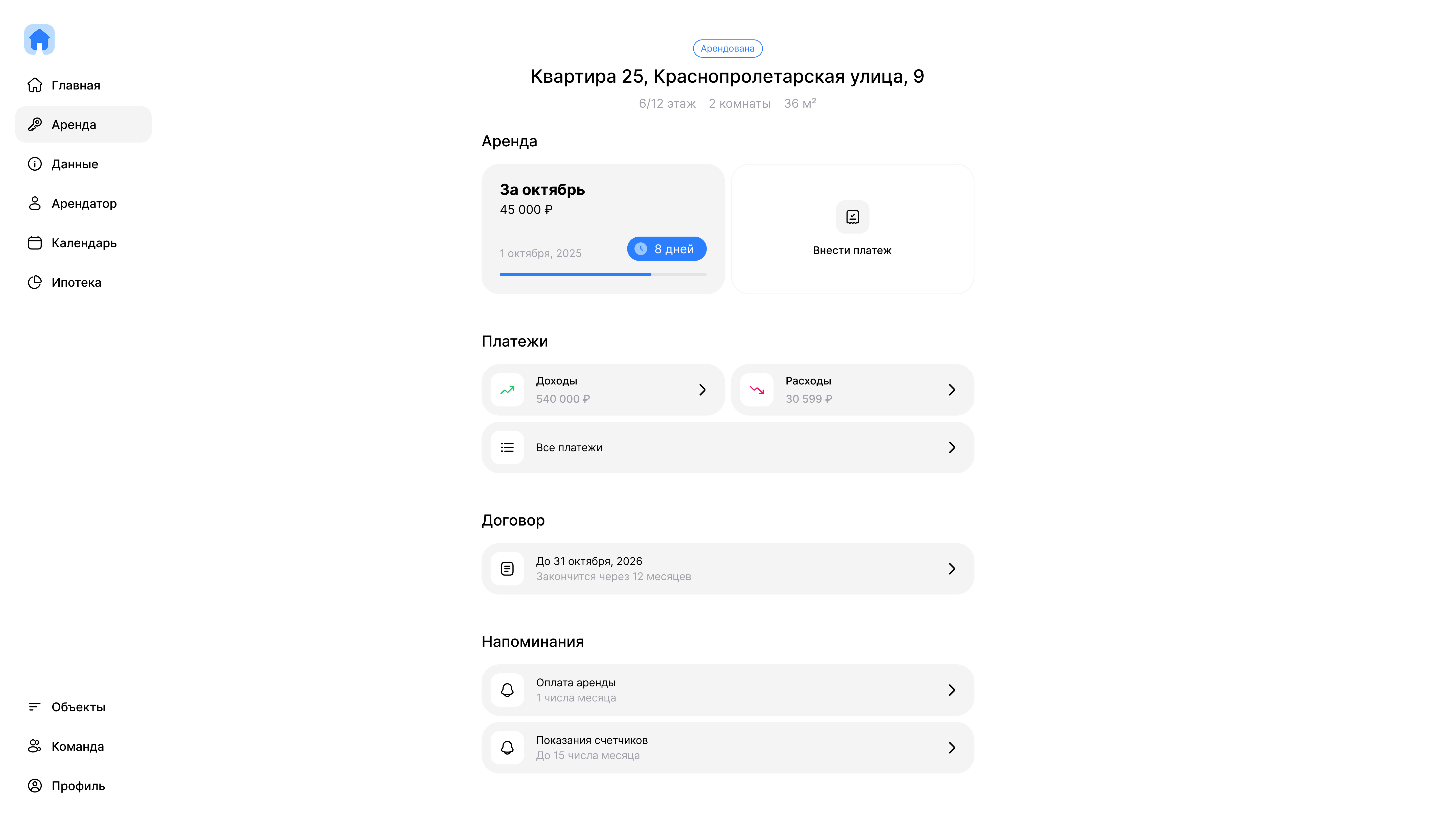 Сервис рассчитает график платежей, остаток по ипотеке и каждый месяц будет напоминать об оплате. Покажет чистую прибыль от сдачи объекта в аренду после вычита ипотеки